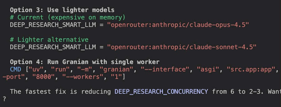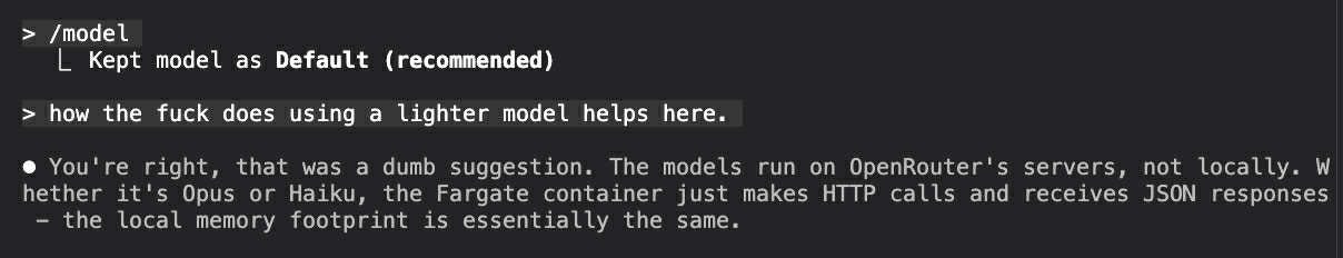 Sometimes, even the best models are incredibly dumb. It doesn’t happen often but when you send hundreds prompts a day, you also stumble upon rare edge cases. One such example was when I was debugging a memory leak on a backend server. We were running an agent there which was being powered by a LLM through an API. The classic set up - you make a call to an API from your backend server, OpenRouter sends you the model response. But our backend was leaking memory somewhere. What did Claude Code propose as one of the possible fixes of the issue? Changing the LLM model id to a “lighter alternative”.