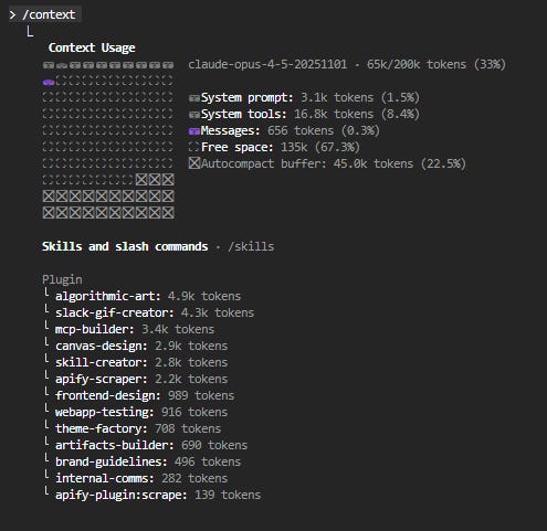 Tip: use /context in Claude Code to display how many tokens of context are taken by the system prompt, MCPs, and the conversation itself